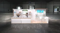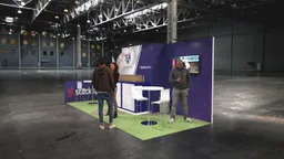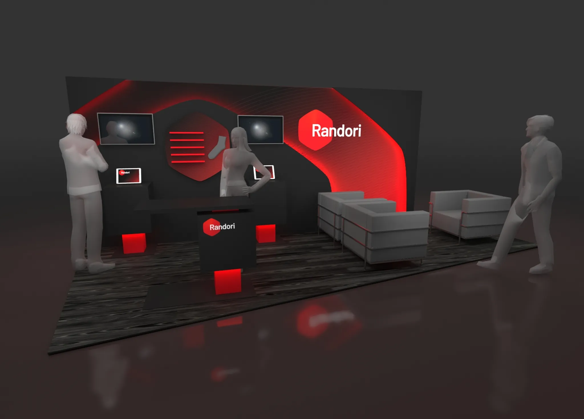 At the forefront, the reception desk stands ready to welcome guests, setting the tone for an engaging experience. Adjacent, a meeting area beckons with its table and chairs, offering a comfortable space for discussions and networking. Dominating the backdrop, the impressive back wall graphics, accompanied by an inbuilt screen and large signage of the logo, create a captivating focal point. With meticulous attention to detail, the booth ensures a clutter-free floor, allowing visitors to navigate the space seamlessly.