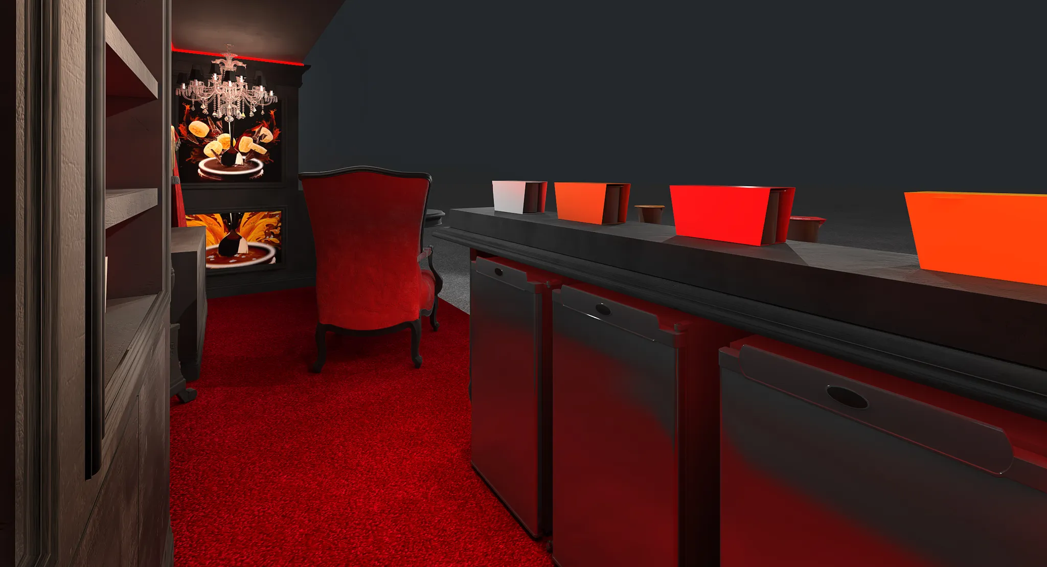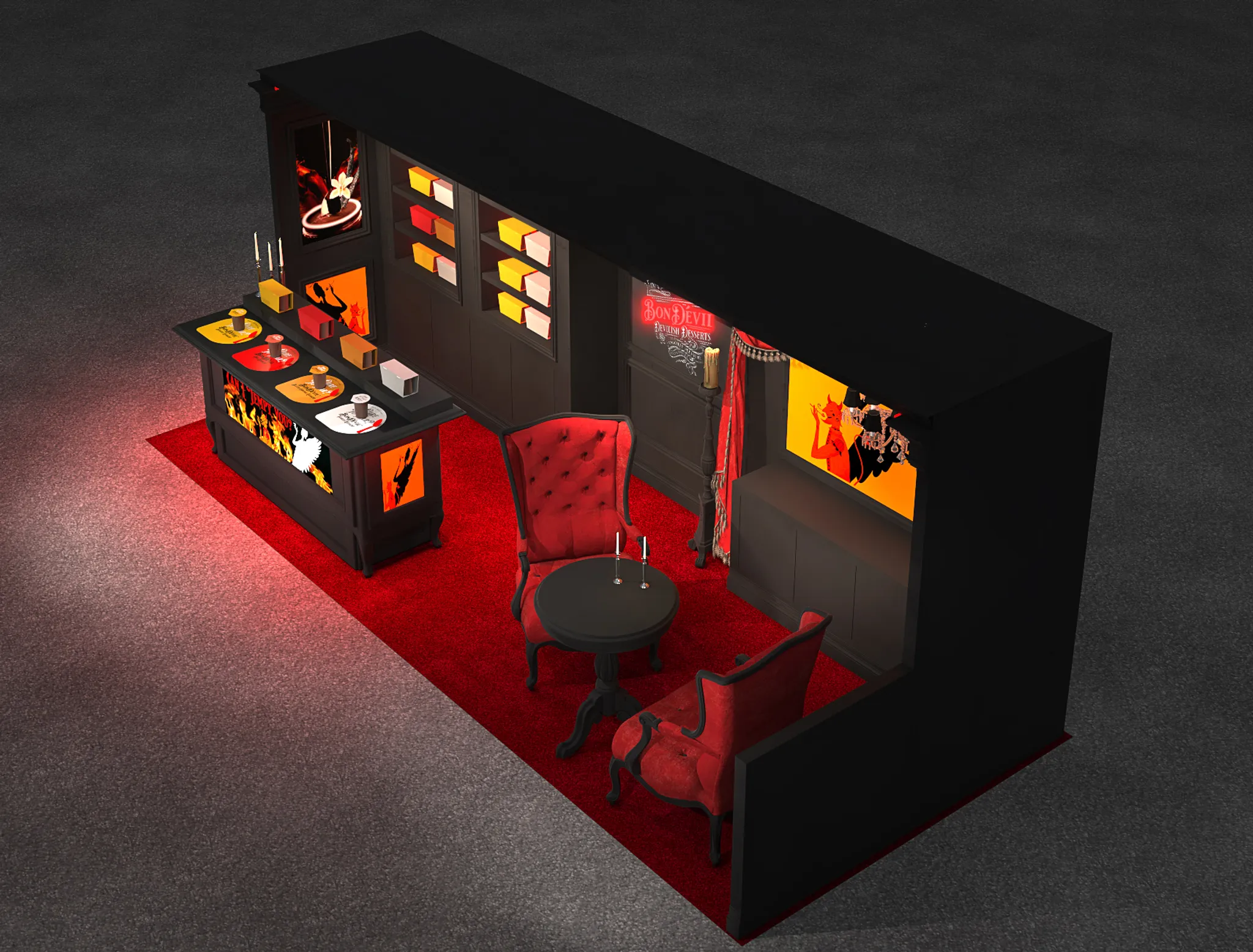 Step into the 10x20 Inline booth and experience the inviting ambiance of a comfy lounge. The emphasis on a devilish red color scheme, accentuated by embedded lighting and fabrics, creates a striking visual feast that commands attention. A wooden bar counter adds a touch of rustic elegance, inviting guests to relax and unwind in style. Above, a chandelier casts a warm glow, adding a touch of sophistication to the space. Welcome to a haven where luxury meets comfort, and every detail is designed to captivate and delight the senses.