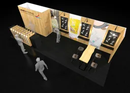 The 10x20 trade show booth combines functionality and style with a warm, natural ambiance. Two small rectangular counters at the front provide welcoming reception points for attendees. High seating areas with circular tables on both sides offer comfortable spaces for meetings and discussions, fostering engagement. The wooden flooring adds a touch of sophistication and warmth, creating a balanced, professional, and inviting environment for visitors.